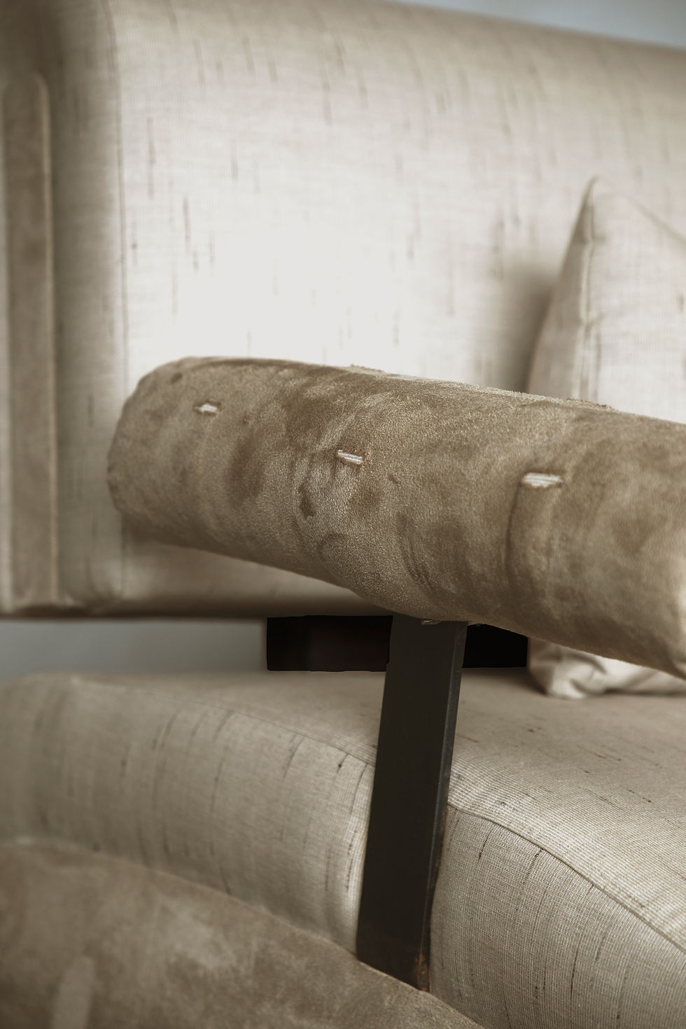 The Leaning Tower of Pisa and Inertia inspired the Pisa Sofa. This sofa features a play on strong forces against thinner materials with its raw steel arm supports and thick rounded upholstered bolster arms.