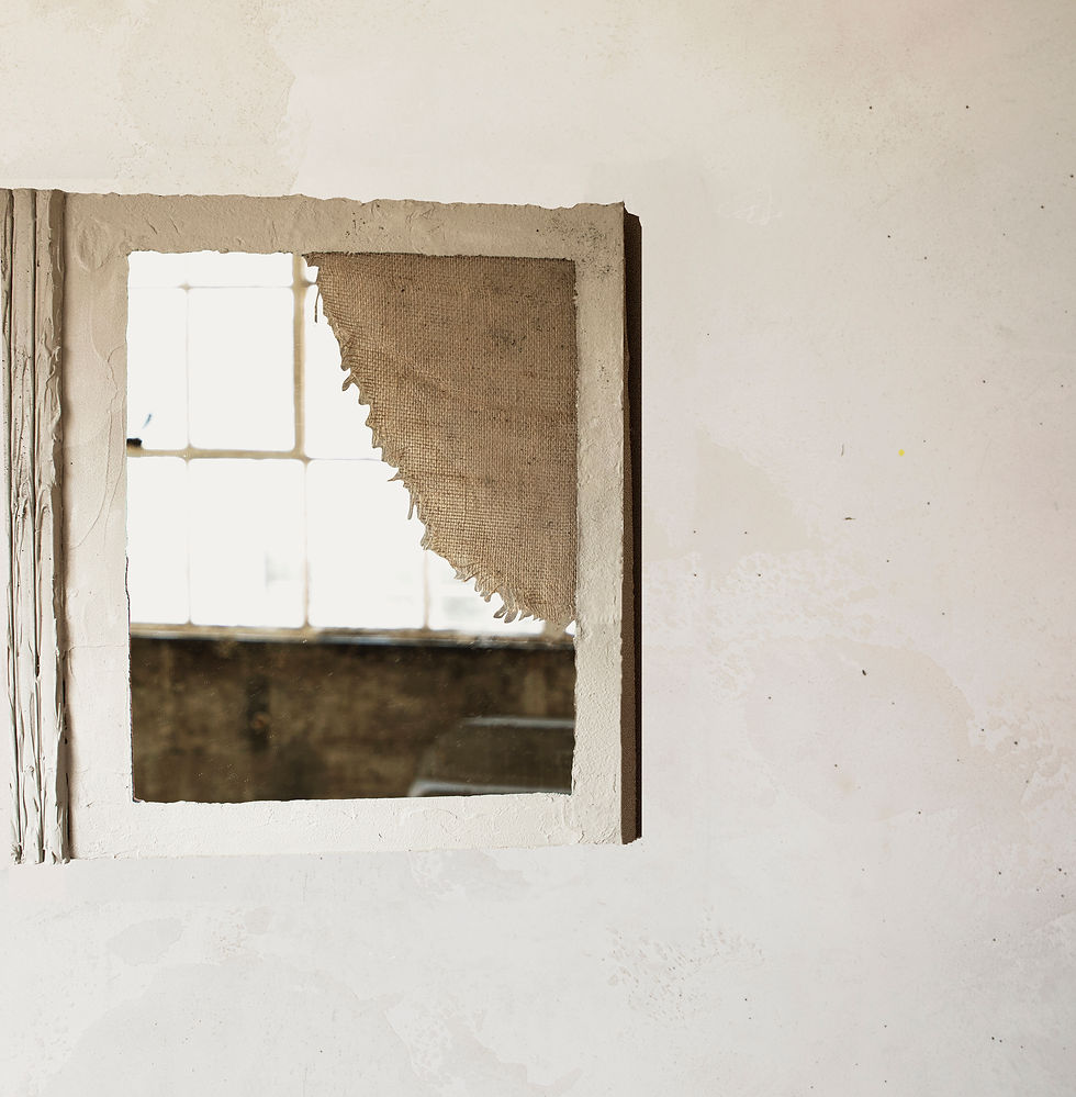 The Roman Fall Mirror consists of burnt ash that is hand-spread and deconstructed burlap to resemble The Fall of The Roman Empire.